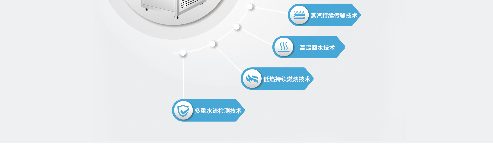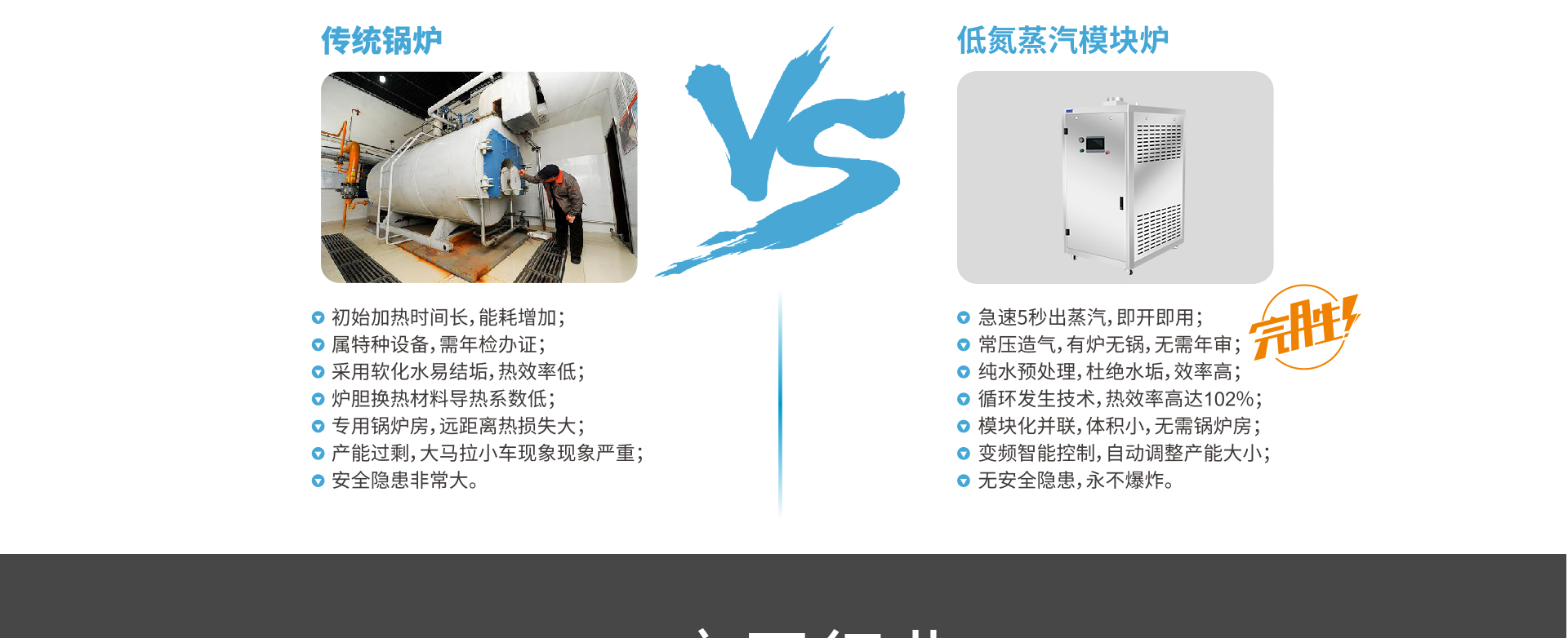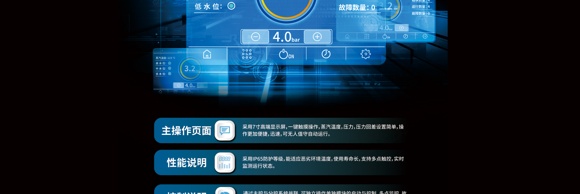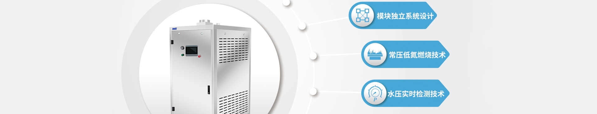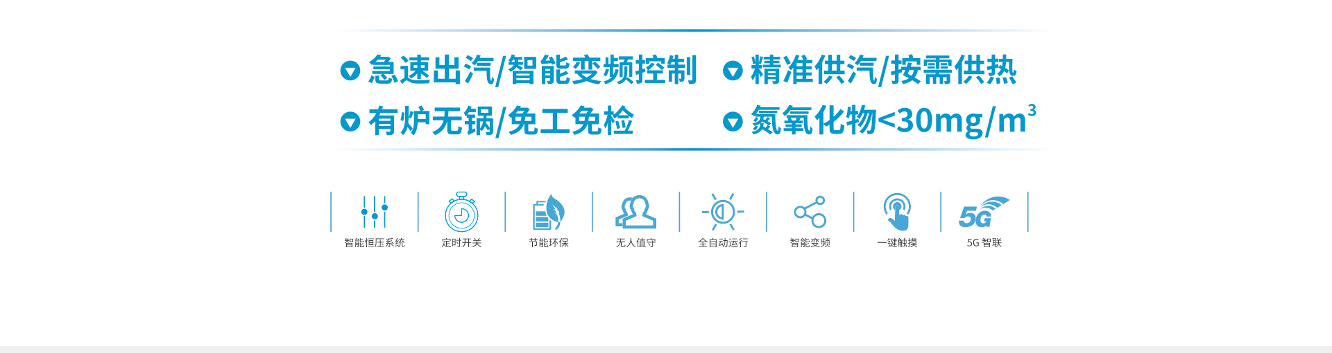 超低氮排放,耐壓0.7mpa,171℃高溫蒸汽,5秒上蒸汽,安全免檢,分級啟動,比例燃燒系統(tǒng),中央控溫系統(tǒng),102%熱效率,變頻控制。